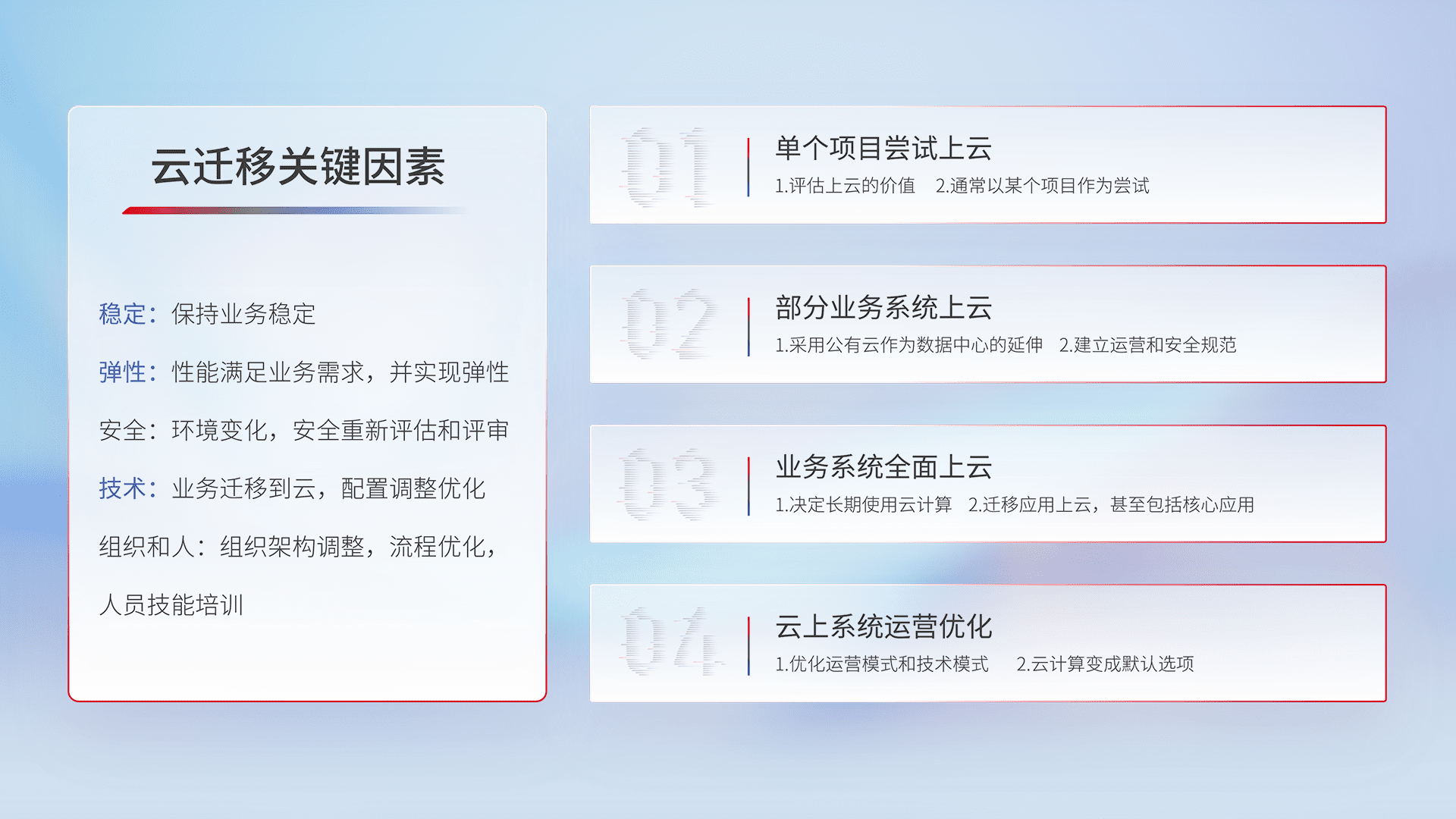 结合实际业务,,,从规划设计、、、、云平台选型、、云原生改造、、数据迁移、、、集成交付,,迁移全过程为客户识别最佳上云路径,,做好风险识别管理,,,,设计网络架构、、、身份权限、、安全审计合规、、操作审计、、日志审计、、监控告警策略、、、多站点容灾设计等,,对云上基础设施进行整体规划,,,,提升IT治理水平,,,以满足弹性、、、高可用、、高性能的需求。。。。